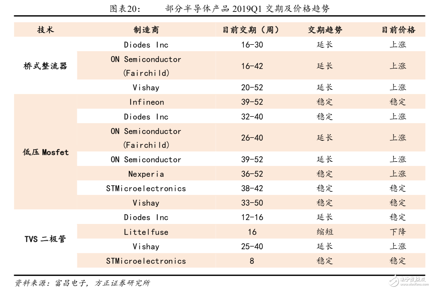國內(nèi)半導體行業(yè)庫存處于低位,部分產(chǎn)品周期見底,預(yù)計19Q2 開始進入補庫存階段。國內(nèi)半導體從 18Q4 開始的庫存修正持續(xù)到現(xiàn)在,渠道庫存已經(jīng)處于低位,近期二極管、MOSFET 等功率器件產(chǎn)品在分銷渠道端出現(xiàn)交期延長、價格上漲的趨勢,側(cè)面驗證部分產(chǎn)品渠道庫存見底。