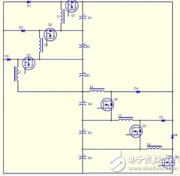 如果電池 B5 電壓過高,控制 Q5 以 PWM 模式工作,當 Q5 開通,電感 L5 儲能;當 Q5 關閉,電感儲存的能量就會通過 D5 給電池 B1-B4 充電,降低 B5 電池電壓抬高其余電池電壓,利用同樣的原理可以分析其余電池組電壓過高時候的工作過程。