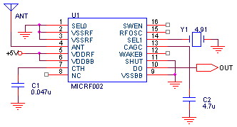 ICRF002使用陶瓷諧振器,換用不同的諧振器,接收頻率可覆蓋300-440MHz。MICRF002具有兩種工作模式:掃描模式和固定模式。掃描模式接受帶寬可達(dá)幾百KHz,此模式主要用來(lái)和LC振蕩的發(fā)射機(jī)配套使用,因?yàn)椋琇C發(fā)射機(jī)的頻率漂移較大,在掃描模式下,數(shù)據(jù)通訊速率為每秒2.5KBytes。固定模式的帶寬僅幾十KHz,此模式用于和使用晶振穩(wěn)頻的發(fā)射機(jī)配套,數(shù)據(jù)速率可達(dá)每秒鐘10KBytes。工作模式選擇通過(guò)MICRF002的第16腳(SWEN)實(shí)現(xiàn)。另外,使用喚醒功能可以喚醒譯碼器或CPU,以最大限度地降低功耗?! ICRF002為完整的單片超外差接收電路,基本實(shí)現(xiàn)了“天線輸入”之后“數(shù)據(jù)直接輸出”,接收距離一般為200米。