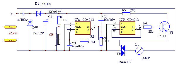 | 電路工作原理:門控開關(guān)電路如下圖,電路采用D型觸發(fā)器CD4013組成開關(guān)記憶電路,IC-A接成單穩(wěn)態(tài)電路,IC-B接成雙穩(wěn)態(tài)電路。GH為常開型干簧管,平時(shí)門關(guān)閉時(shí)GH閉合,。開門時(shí),GH斷開,IC-A的Q1端輸出高電平觸發(fā)IC-B,使Q2輸出高電平,雙向可控硅導(dǎo)通,燈亮,IC-A的單穩(wěn)時(shí)間由R2,C3的數(shù)值決定,圖中元件數(shù)值的單穩(wěn)時(shí)間為7秒,在此時(shí)間內(nèi),無論GH啟閉多少次,Q1均輸出高電平,故在單穩(wěn)時(shí)間內(nèi)開門、進(jìn)門和關(guān)門Q1均保持高電平。單穩(wěn)時(shí)間結(jié)束后,人開門出衛(wèi)生間,Q1又輸出高電平,Q2翻轉(zhuǎn)為低電平,登滅。 |