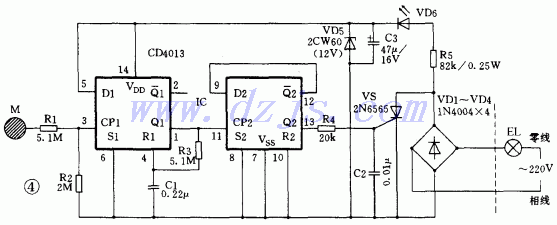 圖4是用雙D觸發(fā)器制作的觸摸開關(guān)。CD4013是雙D觸發(fā)器,分別接成一個(gè)單穩(wěn)態(tài)電路和一個(gè)雙穩(wěn)態(tài)電路。單穩(wěn)態(tài)電路的作用是對觸摸信號進(jìn)行脈沖展寬整形,保證每次觸摸動(dòng)作都可靠。雙穩(wěn)態(tài)電路用來驅(qū)動(dòng)晶閘管VS。當(dāng)人手摸一下M,人體泄漏的交流電在電阻R2上的壓降,其正半周信號進(jìn)入③腳CP1端,使單穩(wěn)態(tài)電路翻轉(zhuǎn)進(jìn)入暫態(tài).其輸出端Q1即①腳跳變?yōu)楦唠娖?,此高電平?jīng)R3向C1充電,使④ 電位上升,當(dāng)上升到復(fù)位電平時(shí),單穩(wěn)態(tài)電路復(fù)位,①腳恢復(fù)低電平。所以每觸摸一次M,①腳就輸出一個(gè)固定寬度的正脈沖。此正脈沖將直接加到11腳CP2端,使雙穩(wěn)態(tài)電路翻轉(zhuǎn)一次,其輸出端Q2即13腳電平就改變一次。當(dāng)13腳為高電平時(shí).VS開通,電燈EL點(diǎn)亮。這時(shí)電容C3兩端的電壓會跌落到3V左右,發(fā)光管VD6熄滅,由于CMOS電路的微功耗特點(diǎn),所以集成塊仍能正常工作。當(dāng)13腳輸出低電平時(shí)。VS失去觸發(fā)電流,當(dāng)交流電過零時(shí)即關(guān)斷,EL熄滅。這時(shí)C3兩端電壓又恢復(fù)到VD5的穩(wěn)壓值12V,VD6發(fā)光用來指示開關(guān)的位置。由此可見,每觸摸一次M,就能實(shí)現(xiàn)電燈“開” 或“關(guān)”,它對外也僅兩根引出線,故安裝與使用都十分方便。