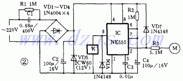 圖2是延遲開關(guān)電路,555集成塊接成單穩(wěn)態(tài)觸發(fā)器,平時(shí)處于復(fù)位狀態(tài),繼電器K不動(dòng)作。當(dāng)M受到觸摸時(shí),電路被觸發(fā)進(jìn)人暫態(tài),③腳輸出高電平,繼電器K吸合,被控電器工作。暫態(tài)時(shí)間t=1.1R2 X C4,暫態(tài)時(shí)間結(jié)束,電路翻轉(zhuǎn)成穩(wěn)態(tài),繼電器K釋放,被控電器停止工作。