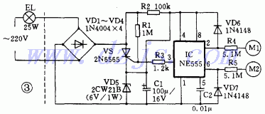 圖3是一個(gè)電源電路采取特殊設(shè)計(jì)的用555時(shí)基電路制作而成的觸摸開關(guān),它對外僅兩根引出線,因此可直接取代普通開關(guān)而不必更改電源布線。EL是不大于25W的白熾燈或交流接觸器。虛線左部為普通照明線路,右部為觸摸開關(guān)電路。IC處于復(fù)位狀態(tài)時(shí),③腳輸出低電平,晶閘管VS的門極通過電阻R3被鉗位在低電平,故VS關(guān)斷,EL不亮,此時(shí)555的工作電源由220V交流電經(jīng)燈EL、二極管VD1~VD4整流、電阻R2限流、VD5穩(wěn)壓與IC1濾波獲得約6V直流工作電壓供電。當(dāng) 555時(shí)基電路②腳受觸發(fā)處于置位時(shí),IC③腳輸出高電平,VS開通,EL點(diǎn)亮發(fā)光。VS開通后,555工作電源直接由燈EL、二極管VD1~VD4、晶閘管VS與穩(wěn)壓管VD5構(gòu)成回路,C1兩端仍能獲得6V直流工作電壓,只是此時(shí)電阻R2不起作用。