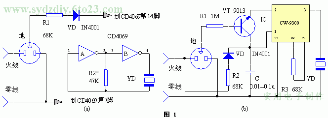 圖(b)采用一片CW9300音樂(lè)IC制作的漏電報(bào)警器,由于R1和VT構(gòu)成了高靈敏觸發(fā)電路,因此,該報(bào)警器靈敏度較高,其泄漏報(bào)警電流小于10uA。音樂(lè)IC的工作電壓由R2降壓、VD整流、C濾波后供給。由于該電壓取自220V市電火線,因此,同某些靠泄漏電流、電壓維持IC發(fā)聲的報(bào)警電路相比,不僅報(bào)警音量較大,且克服了上述電路音量隨漏電流大小而變化的不足。
