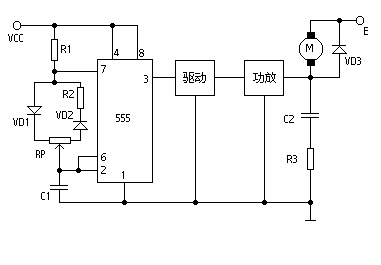 這是一個占空比可調的脈沖振蕩器。電機M是用它的輸出脈沖驅動的,脈沖占空比越大,電機電驅電流就越小,轉速減慢;脈沖占空比越小,電機電驅電流就越大,轉速加快。因此調節(jié)電位器RP的數值可以調整電機的速度。如電極電驅電流不大于200mA時,可用CB555直接驅動;如電流大于200mA,應增加驅動級和功放級。