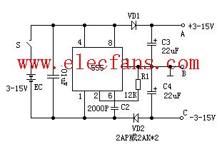 附圖電路中,時基電路555接成無穩(wěn)態(tài)電路,3腳輸出頻率為20KHz、占空比為1:1的方波。3腳為高電平時,C4被充電;低電平時,C3被充電。由于 VD1、VD2的存在,C3、C4在電路中只充電不放電,充電最大值為EC,將B端接地,在A、C兩端就得到+/-EC的雙電源。本電路輸出電流超過 50mA。