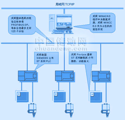 ????采用德國西門子公司的S7系列PLC作為機電一體化機組的現(xiàn)場控制設(shè)備,通過智能通訊模塊與中央數(shù)據(jù)采集的PROFIBUS總線相連,中央數(shù)據(jù)采集由德國西門子公司最新推出的基于PC的自動化產(chǎn)品WINAC?4.0承擔(dān),該產(chǎn)品可以結(jié)合PCI插槽的CP5613卡實現(xiàn)4條PROFIBUS總線下最大500個PROFIBUS從站(125×4)的網(wǎng)絡(luò)連接,上位機的監(jiān)控軟件則采用西門子公司在自動化領(lǐng)域最先進技術(shù)與微軟公司共同開發(fā)的處于世界領(lǐng)先地位的組態(tài)軟件WINCC?6.0。而在觸摸屏部分,選用了在HMI市場處于領(lǐng)先地位的Pro-face公司最新推出的小型觸摸屏ST系列。系統(tǒng)結(jié)構(gòu)參見圖1: