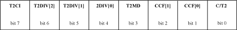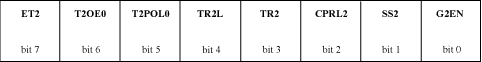 | MODE | T2MD | C/T2 | CCF[1:0] | T2OE[0] | T2OE[1] | T2POL[0] | T2POL[1] | G2EN | SS2 | CPRL2 |