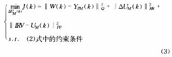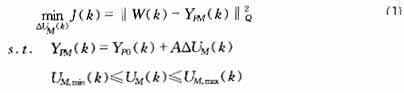 ??? 其中,W(k)為參考軌跡,(S×P)維向量;YPM(k)為ΔUM(k)作用下模型預(yù)測輸出,(S×P)維向量;YP0(k)輸出預(yù)測初值,(S×P)維向量;A為動態(tài)矩陣,由階躍響應(yīng)系數(shù)排成的(S×P)×(R×M)維矩陣;Q=block-diag(Q1,…,Qs),Qi=diag[qi(1),…,q?i(p)],i=1,…,S。