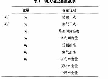 ??? 例1[6]過程是由三個產(chǎn)品抽出和三個回流組成的重油分餾塔,塔底回流溫度是操作約束。操縱變量是塔頂和側(cè)線的抽出以及塔底的回流量。塔頂回流用來和其它裝置換熱,可以認為是可測擾動。4個輸出包括u3的理想穩(wěn)態(tài)值,輸出輸入變量如表1。