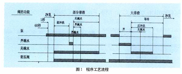 ??? 如表1,大排渣、小排渣的動作是由開碗水、關(guān)碗水的兩個電磁閥動作組合。小排渣的主要任務(wù):相對短時間對設(shè)備進行清理。其動作時序,如圖l,關(guān)碗水的動作是由前沖洗,后沖洗構(gòu)成。部分排渣是開碗水動作;大排渣的主要任務(wù):固定時間由遠程控制器發(fā)送給控制器,對設(shè)備進行清理。相對小排渣而言,是幾次小排渣后,大排渣是對凈乳機腔體進行的較為徹底的清理。溢流是對腔體上部和管道的清理,通過定時對備壓閥的關(guān)閉(憋壓)來實現(xiàn)。這三個動作時間可在面板上設(shè)定。在自動狀態(tài)下,是由遠程控制器來發(fā)出此命令。小排渣,大排渣也有一定的區(qū)別,小排渣時,掙乳機照樣進料,而大排渣時,由于對凈乳機的轉(zhuǎn)數(shù)影響較大,需關(guān)閉進料閥,等待凈乳機的轉(zhuǎn)數(shù)提高到一定程度后,再打開進料閥。此時間可以設(shè)定。