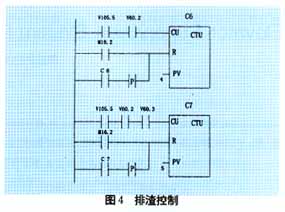 ??? 在程序設(shè)計上,設(shè)置軟件通訊握手位,實時與CONTROLLOGIX處理器進行通訊,必要時做出相應(yīng)的調(diào)整,保證系統(tǒng)的正常運行。如表1所示,在由“循環(huán)”狀態(tài)轉(zhuǎn)到“產(chǎn)品”狀態(tài)時,處理器既要完成自己的小排渣動作,還要接收CONTROLLOGIX發(fā)出的大排渣動作,正常的動作時序是大排渣間隔是1小時,小排渣的間隔是16分鐘,如果兩者相隔時間太近,會造成沒有必要的浪費,也影響凈乳的效果。用如下的編程方法實現(xiàn)了上述功能。如圖4,其中C6,C7分別為小排渣計數(shù)器和復位計數(shù)器,m16.2為大排渣動作,v60.3為“循環(huán)”狀態(tài)位。當“循環(huán)”時,小排渣始終進行,C6不復位;“產(chǎn)品”狀態(tài)時,兩個大排渣之間(1小時),進行三次小排渣,C7對C6復位,重新計數(shù)。
