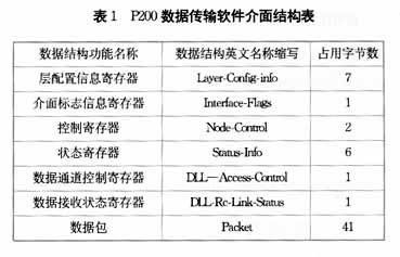 ??? 本文中P200模塊完成一個標準數(shù)據(jù)塊的雙向傳輸任務(wù),為此設(shè)計了專用的數(shù)據(jù)傳輸軟件介面,如表1所示,這個軟件介面由59個字節(jié)的寄存器數(shù)據(jù)結(jié)構(gòu)組成。這個數(shù)據(jù)結(jié)構(gòu)共有7個部分,各部分的主要功能如下表: