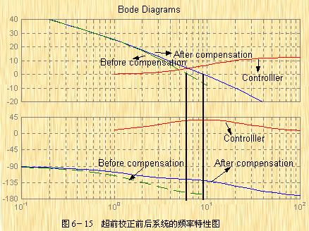 未校正系統(tǒng)的伯德圖如圖6—17中的虛線所示。由圖可得到系統(tǒng)相位裕量等于 ,表明原系統(tǒng)是不穩(wěn)定的。在這種情況下,如果采用超前校正,由于系統(tǒng)的剪切頻率的增大使原系統(tǒng)產(chǎn)生的遲后相位的增加比超前校正裝置提供的相位增加還快,這樣無法起到校正的作用,同時將增大剪切頻率,不利抑制噪聲。