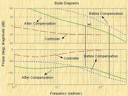 從而可得到補償器的Bode圖如圖6-18b所示??梢钥闯?,在頻率 處系統(tǒng)的幅值和相位均增加了。在這樣的控制器下,校正后系統(tǒng)的相位裕量增加到 ,而剪切頻率增加到 。