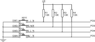 ??? 鍵盤輸入的功能主要包括設(shè)定溫度、在LED顯示中進(jìn)行顯示實(shí)際溫度和顯示工作時(shí)間這兩者循環(huán)顯示的時(shí)候進(jìn)行選擇。同時(shí)考慮避免誤操作而引起的設(shè)定溫度的改變,所以系統(tǒng)專門增加一個(gè)確定鍵。因此該系統(tǒng)具有4個(gè)按鍵:模式選擇、增加按鈕、減少按鈕及確定按鈕。電路如圖5所示。
