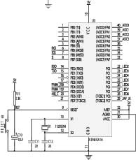 ??? 選用高性能、低功耗的8位ATMEGA16單片機(jī),它具有如下特點(diǎn):16KB的系統(tǒng)內(nèi)可編程Flash(具有同時(shí)讀寫的能力,即RWW);512B EEPROM;1KB SRAM;32個(gè)通用I/O口線;32個(gè)通用工作寄存器;3個(gè)具有比較模式的靈活的定時(shí)器/計(jì)數(shù)器(T/C);可編程串行接口;低功耗空閑和掉電方式等。ATMEGA16的主電路如圖2所示。