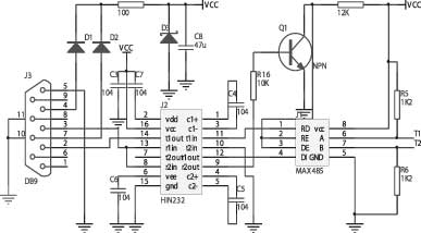 ??? 通信傳輸采用標(biāo)準(zhǔn)的RS485或RS232計(jì)算機(jī)數(shù)據(jù)串行通信方式,通過(guò)串口按一定的通信協(xié)議接收來(lái)自計(jì)算機(jī)串口RS232的信號(hào),經(jīng)過(guò)處理后按一定的規(guī)律傳送到顯示屏上顯示。通信接口電路如圖6所示。