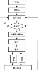 ??? 初始化模塊完成I/O的設(shè)置、數(shù)據(jù)存儲(chǔ)器分配(包括A/D采樣的結(jié)果、輸入按鍵的鍵碼、程序標(biāo)志等) 、定時(shí)器、A/ D的設(shè)置并開(kāi)中斷;循環(huán)掃描模塊檢測(cè)是否有鍵盤輸入、A/D轉(zhuǎn)換完成否、是否定時(shí)中斷等判別任務(wù)。若有則轉(zhuǎn)跳至相應(yīng)的子程序或中斷程序;中斷處理模塊依據(jù)狀態(tài)完成定時(shí)計(jì)數(shù)、A/D采樣、鍵盤掃描等任務(wù);顯示驅(qū)動(dòng)模塊依據(jù)狀態(tài)完成溫度或系數(shù)的顯示;鍵盤處理模塊檢測(cè)鍵碼并進(jìn)入相應(yīng)處理程序;定時(shí)中斷模塊完成定時(shí)計(jì)數(shù),定時(shí)間隔約為1s,為系數(shù)的設(shè)置提供數(shù)碼;溫度控制模塊依據(jù)測(cè)得的數(shù)據(jù)和預(yù)置數(shù)的差確定控制信號(hào)的輸出。