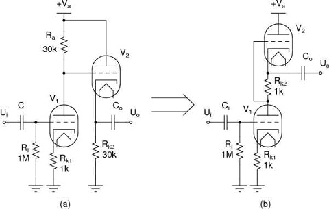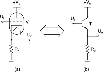 而下圖是實現(xiàn)同樣功能的電子管陰極跟隨器和射級跟隨器。