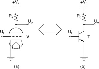 該電路事實上是一個SRPP電路和陰極輸出器的級聯(lián),兩者之間直接耦合。對于我們這一代人來說,晶體管電路已經(jīng)先入為主,一下子可能還不能接受電子管電路。實際上,電子管電路實現(xiàn)的是和晶體管電路同樣的功能。下圖是實現(xiàn)同樣功能的電子管共陰極放大器和晶體管共射極放大器。