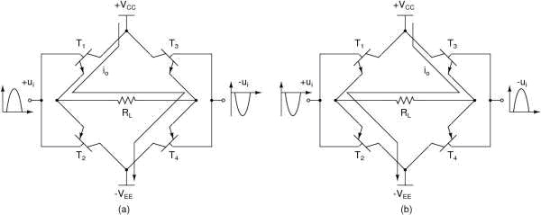OTL電路采用單電源即可工作,所以在便攜式功放中很常用,如果不加輸出電容,則穩(wěn)態(tài)時輸出電壓為0.5Vcc,所以輸出電容不可省去。但是輸出電容也影響了電路的低頻響應。為了提高低頻響應,OCL電路使用對稱雙電源供電,使穩(wěn)態(tài)輸出為0V,省去輸出電容。這時,加在負載上的最大電壓為Vcc。這樣電源電壓利用率偏低,因為整個電源電壓為2Vcc。提高利用率的方式是使用BTL電路,負載接在電橋中,兩端的最大電壓可達2Vcc,相同供電電壓下輸出功率是OCL的四倍,但是元件數(shù)量翻倍。下圖示出了BTL電路的原理。每次都是電橋?qū)?cè)橋臂上的管子同時導通和截止。由于負載中點電壓始終在0V,我們可以把BTL電路看成是兩個等效負載為0.5RL的OCL電路。