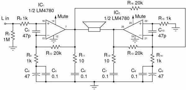 現(xiàn)在沒有人會用分立元件組裝BTL后級,因為與其消耗多一倍的元件搭建電路,不如把電源電壓提高一倍來提高輸出功率成本低廉。但是,集成電路工藝限制了集成功放芯片供電電壓的提升。LM4780的極限工作電壓為+-42V,已經(jīng)是很高了,通常工作在+-35V,這時的輸出功率在50W(8歐負載)。要想獲得100W以上的輸出功率,只有考慮BTL電路了。順便說一句,現(xiàn)在的便攜式設備如果有揚聲器,也偏向于使用BTL,因為電池電壓低,要提高功率,使用BTL是上策,因為在集成電路里多做一個放大器成本也增加不了多少。用集成放大器實現(xiàn)BTL的方法可以有以下兩種。