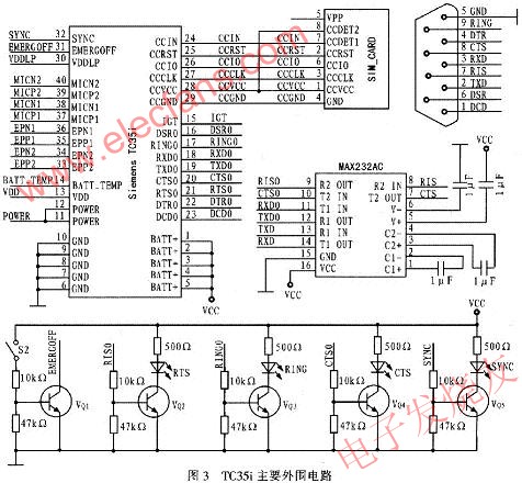 系統(tǒng)組成如圖1所示,系統(tǒng)硬件主要是TC5i無線通訊模塊的應(yīng)用。TC35i是Siemens公司推出的新一代無線通信GSM模塊,TC35i雙頻工作(EGSM900/GSMl800),電源范圍在3.3~4.8 V,發(fā)送功率分別為2W(Class4 EGSM900)和lW(Classl GSMl800 MHz),TC35i的數(shù)據(jù)接口采用串行異步收發(fā),符合ITU-TRS-232接口電路標(biāo)準(zhǔn)。數(shù)據(jù)接口配置為8位數(shù)據(jù)位、1位停止位、無校驗(yàn)位,可以在300~115 kb/s的波特率下運(yùn)行,支持的自動波特率為4.8~115 kb/s,符合ETSI標(biāo)準(zhǔn)GSM0707和GSM0705,且易于升級為GPRS模塊。該模塊集射頻電路和基帶于一體,向用戶提供標(biāo)準(zhǔn)的AT命令接口。為數(shù)據(jù)、語音和短消息提供快速、可靠、安全的傳輸,方便用戶的應(yīng)用開發(fā)及設(shè)計(jì)。TC35i有40個引腳,通過ZIF連接器引出。這些引腳可劃分為5類,即電源、數(shù)據(jù)輸入/輸出、SIM卡、音頻接口和控制。TC35i內(nèi)部電路如圖2所示。歡迎轉(zhuǎn)載,本文來自電子發(fā)燒友網(wǎng)(http://www.greenbey.cn/)
