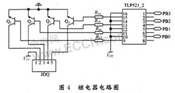 ??? 系統(tǒng)輸出功率控制有4路,分別有從機ATmega16單片機PB0~PB3端口控制溫差循環(huán)、電加熱循環(huán)、防凍循環(huán)等功能。當(dāng)主機按“溫差循環(huán)”鍵時,主機將把信號發(fā)送給從機,從機再將RB0置高,啟動手動循環(huán),再次按“循環(huán)”鍵,程序使RB0輸出低電平口,關(guān)閉手動循環(huán)。其他功能與“溫差循環(huán)”基本相同。為了防止繼電器可能干擾單片機的控制電路部分,在單片機PB輸出口與繼電器驅(qū)動接口電路之間加入了光電耦合器TLP521_2,如圖4所示。