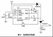 電源倍壓電路如圖6所示,NE555定時器工作于多諧振蕩器模式,于引腳3產(chǎn)生幅值等于NE555的供電電壓,頻率為1/0.7(R2+2R1)C1的矩形波。C3、C4,Dl和D2構(gòu)成電荷泵電路。當(dāng)NE555引腳3輸出高電平時,由于電容電壓不能突變,C3正極電壓為24V或接近24V,并通過D2向C4充電,使C4電壓為24V或接近24V。由于受電路的工作效率、二極管D1和D2上的正向電壓降以及負(fù)載能力的限制,使得系統(tǒng)輸出電壓低于供電電壓的2倍。