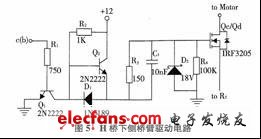直流電動機(jī)是EPS系統(tǒng)的執(zhí)行元件,電機(jī)的控制電路在系統(tǒng)設(shè)計中有著特殊的地位。在本系統(tǒng)中采用脈寬調(diào)制(PWM)控制H橋電路實(shí)施對直流電動機(jī)的控制,由4個功率MOSFET組成,如圖3所示。采用PWM伺服控制方式,MOSFET功率管的驅(qū)動電路簡單,工作頻率高,可工作在上百千赫的開關(guān)狀態(tài)下。系統(tǒng)采用4個International Reetifier公司生產(chǎn)的IRF3205型MOSFET功率管組成H橋路的4個臂。IRF3205具有8 mΩ導(dǎo)通電阻、功耗小、耐壓達(dá)55V、最大直流電流110A、滿足EPS系統(tǒng)對MOSFET功率管低壓(正常工作不超過15V)大電流(額定電流30 A)的要求。