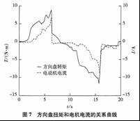 根據(jù)電動轉(zhuǎn)向控制系統(tǒng)對穩(wěn)定性和跟蹤性的需要,采用最優(yōu)H二控制器編制電動轉(zhuǎn)向系統(tǒng)控制程序,并在汽車電動轉(zhuǎn)向試驗(yàn)臺上進(jìn)行臺架模擬試驗(yàn),車速信號用模擬車速傳感器發(fā)出的脈沖信號代替網(wǎng)。圖7為中等車速轉(zhuǎn)向助力時,測量的方向盤轉(zhuǎn)矩(T)和助力電動機(jī)電流(I)變化曲線。從圖7中可以看出,在轉(zhuǎn)向過程中,助力電動機(jī)電流隨著方向盤轉(zhuǎn)矩的變化而變化,電動機(jī)電流的變化趨勢和方向盤轉(zhuǎn)矩的變化趨勢相吻合,表明電動機(jī)的助力轉(zhuǎn)矩對方向盤轉(zhuǎn)矩有良好的跟蹤性能。轉(zhuǎn)向操作時,無助力滯后感,轉(zhuǎn)向平穩(wěn),表明轉(zhuǎn)向系統(tǒng)具有良好的跟蹤性能和操縱穩(wěn)定性。