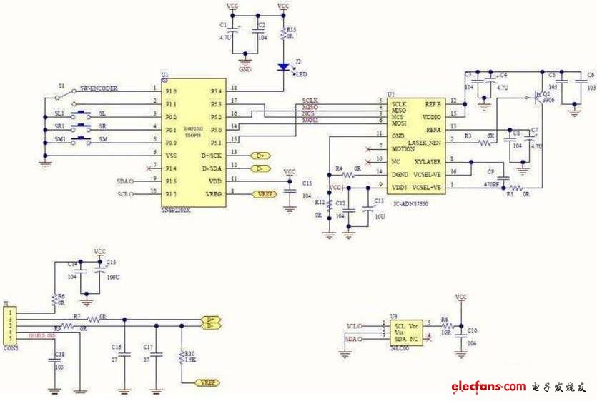 下圖為有線USB光學(xué)游戲鼠標(biāo)電路圖: 圖 有線USB光學(xué)游戲鼠標(biāo)電路圖