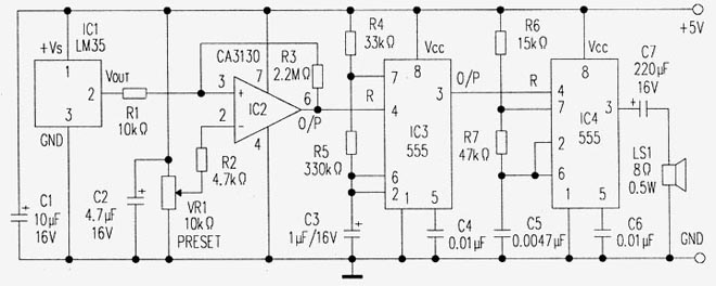 ??? 傳感器LM35(IC1)提供片內(nèi)信號調(diào)節(jié)功能,包括放大、電平移位和倒相。信號調(diào)節(jié)后,溫度每升1℃,輸出就增加10mv。因此對于0℃至100℃的溫度范圍,相應(yīng)的輸出電壓范圍為0V至1V。運放CA3130(IC2)為電壓檢測級,它將溫度傳感器的輸出電壓與比較器預(yù)置的基準(zhǔn)電壓相比較。如溫度傳感器的輸出電壓超過基準(zhǔn)電壓,則比較器的輸出變高,使后面的低頻振蕩器IC3投入工作,轉(zhuǎn)而激活音頻振蕩器驅(qū)動揚聲器LS1發(fā)出“畢……畢”的報警聲。基準(zhǔn)電壓的大小決定了觸發(fā)報警的溫度。