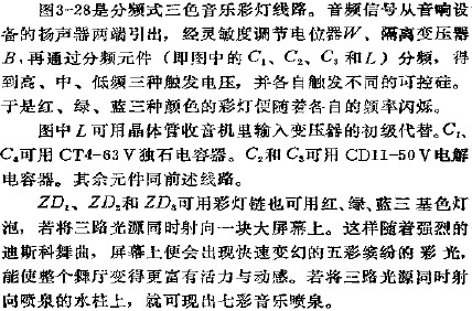 三分頻音樂彩燈電路圖輸入音頻經(jīng)虛線框內(nèi)的三分頻網(wǎng)絡(luò)分頻后去控制SCR1-SCR3,從而使彩燈L1,L2,L3分別受到高中低頻音樂信號(hào)控制。它們發(fā)光亮度將