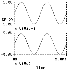 (1) Vi幅值為5V,頻率為1KHz的正弦波。作瞬態(tài)分析,觀察輸出Vo形的交越失真。進一步作直流掃描分析,求失真所對應(yīng)的輸入電壓范圍。