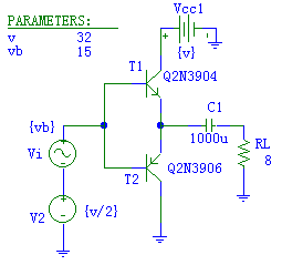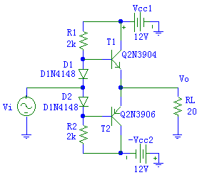 例1 乙類互補對稱功放電路如圖LT_01a所示,試運用PSPICE分析該電路。