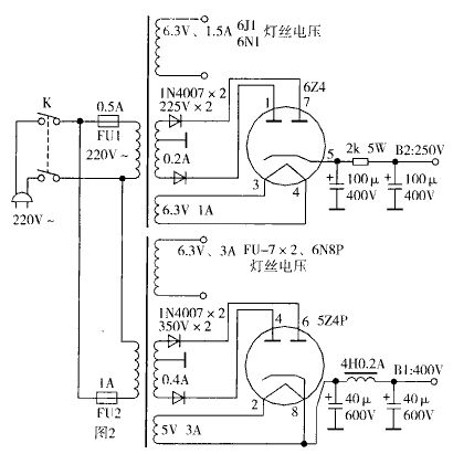 元器件選擇:(1)功放級(jí)采用兩只FU-7(}!外型號(hào)為807;(2)倒相級(jí)采用6N8P; (3)前置放大及音質(zhì)調(diào)節(jié)級(jí)采用6J1、6N1,該部分單獨(dú)供電,并經(jīng)嚴(yán)格隔離,尤其是6,11,最好單獨(dú)加隔離罩,周邊再加金屬隔離板。