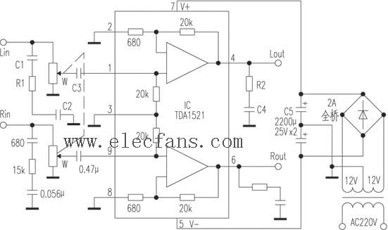 關(guān)鍵字:TDA1521,功放電路圖