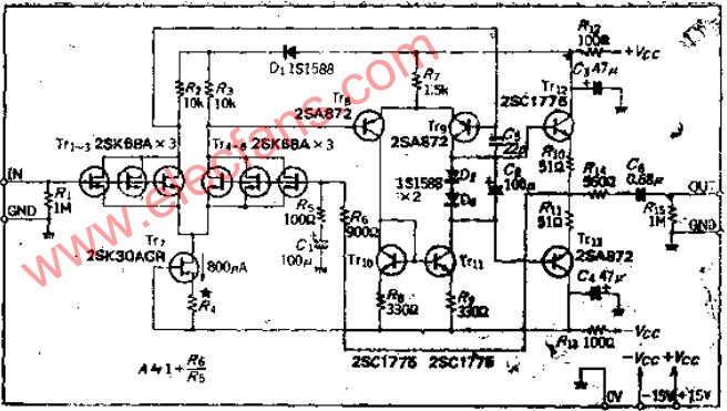 在多極放大電路中,初級的噪聲特性決定了整個電路S/N的大小,因此要選用低噪聲的元件。TT1~TT0選用互導(dǎo)GM大的低噪聲FET(2SK68A)。