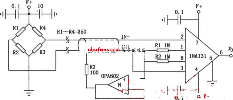 如圖所示為高精度測量放大器,圖中輸入信號來自電橋式傳感器(如應(yīng)變稱重傳感器、位移測量傳感器等)。這種接法對50Hz電源干擾以及高的共模干擾有極高的抑制能力。放大倍數(shù)為100,若需要更高增益,可在①、⑧腳之間接一個增益電阻RG,增益大小為:G=100+250kΩ/RG。