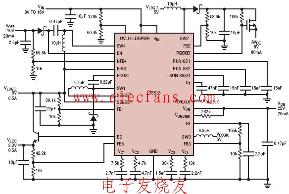 LT3513應(yīng)用電路:LT3513 pdf datasheet (2MHz High Current 5-Output Regulator for TFT-LCD Panels)