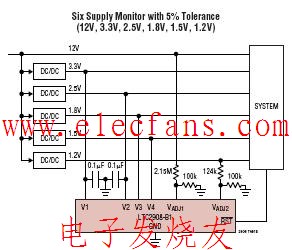 或更多 LTC2908 的漏極開路 RST 輸出線“或”連接在一起,用于監(jiān)視具有多于 6 個電源電壓的系統(tǒng)。公用復位輸出保持低電平,直到所有