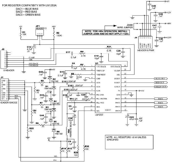 DescriptionThe LM1237 pre-amp is an integrated CMOS CRT preamp.It has an I2C compatible interface which allows control of al