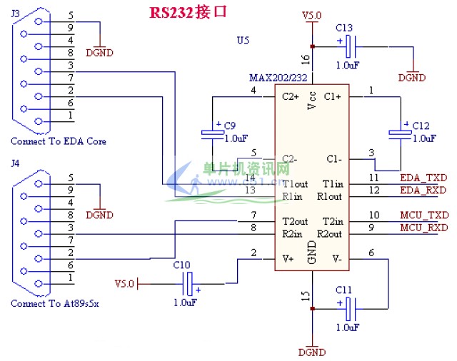 232是電荷泵芯片,可以完成兩路TTL/RS-232電平的轉(zhuǎn)換,它的的9、10、11、12引腳是TTL電平端,用來(lái)連接單片機(jī)的。