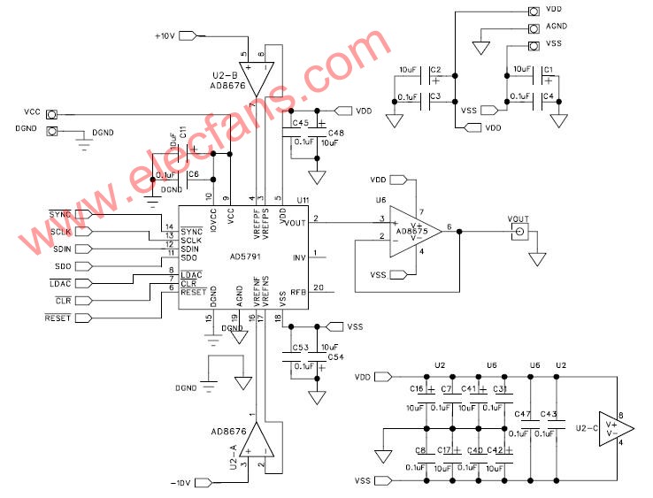 2993 其中以AD5791 (U1)作為精密數(shù)控1 ppm電壓源,電壓范圍為±10 V,增量為20 μV;以AD8676 (U2)作為基準(zhǔn)緩沖;以AD8675 (U3)作為輸