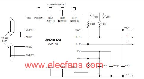 The MAX1441 proximity and touch sensor IC is designed for capacitive proximity sensing in automotive Passive Remote Keyless Entry (PRKE) and other applications. This device provides signal processing to support two independent touch/proximity sensor channels. The device features two open-drain output pins with high-voltage capability up to 28V as well as five digital I/Os to indicate sensing events. During manufacturing JTAG programming uses four digital I/Os.