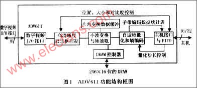 ℃。該芯片不僅集成了視頻編碼/解碼算法,還提供了數(shù)據(jù)壓縮效果的實(shí)時(shí)調(diào)節(jié)手段,數(shù)據(jù)輸出速率可以靈活控制。ADV611能實(shí)時(shí)地對包括PAL制式(720×288@50場/s)和NTSC制式(720×243@60場/s)在內(nèi)的視頻信號實(shí)時(shí)進(jìn)行壓縮和解壓縮。壓縮倍數(shù)從視覺無失真感的4∶1到7500∶1,