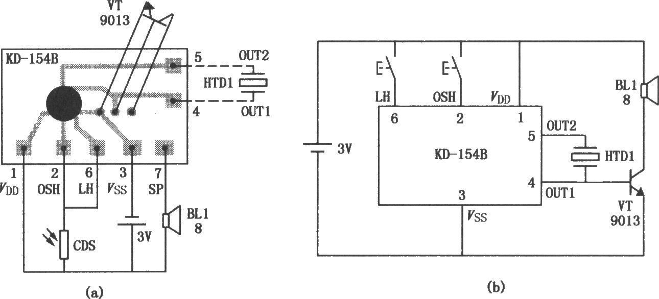 KD-1548是大規(guī)模CMOS集成電路,可通過外接光敏電阻器(CDS)實現(xiàn)光控功能,也可作為普通音樂集成電路使用,廣泛用于光控提醒器、告警器、光控玩具、工藝品等。KD-1548作光控觸發(fā)時的典型應(yīng)用電路如圖(a)所示;用作普通音樂集成電路的典型應(yīng)用如圖(b)所示。這時,若單獨按一下OSH鍵,電路觸發(fā),演奏完一首樂曲之后自動停止。若單獨按LH鍵,音樂開始,松開LH則音樂聲立即停止。此外,還有一類芯片具有中斷功能,即按OSH鍵音樂開始,按LH鍵音樂立即中斷停止。因此購買KD-1548時,應(yīng)注意OSH和LH是屬于哪一類工作模式。