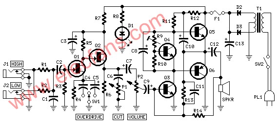 It also features a two-FET preamplifier, two inputs with different sensitivity, a treble-cut control and an optional switch allowing overdrive or powerful treble-enhancement.